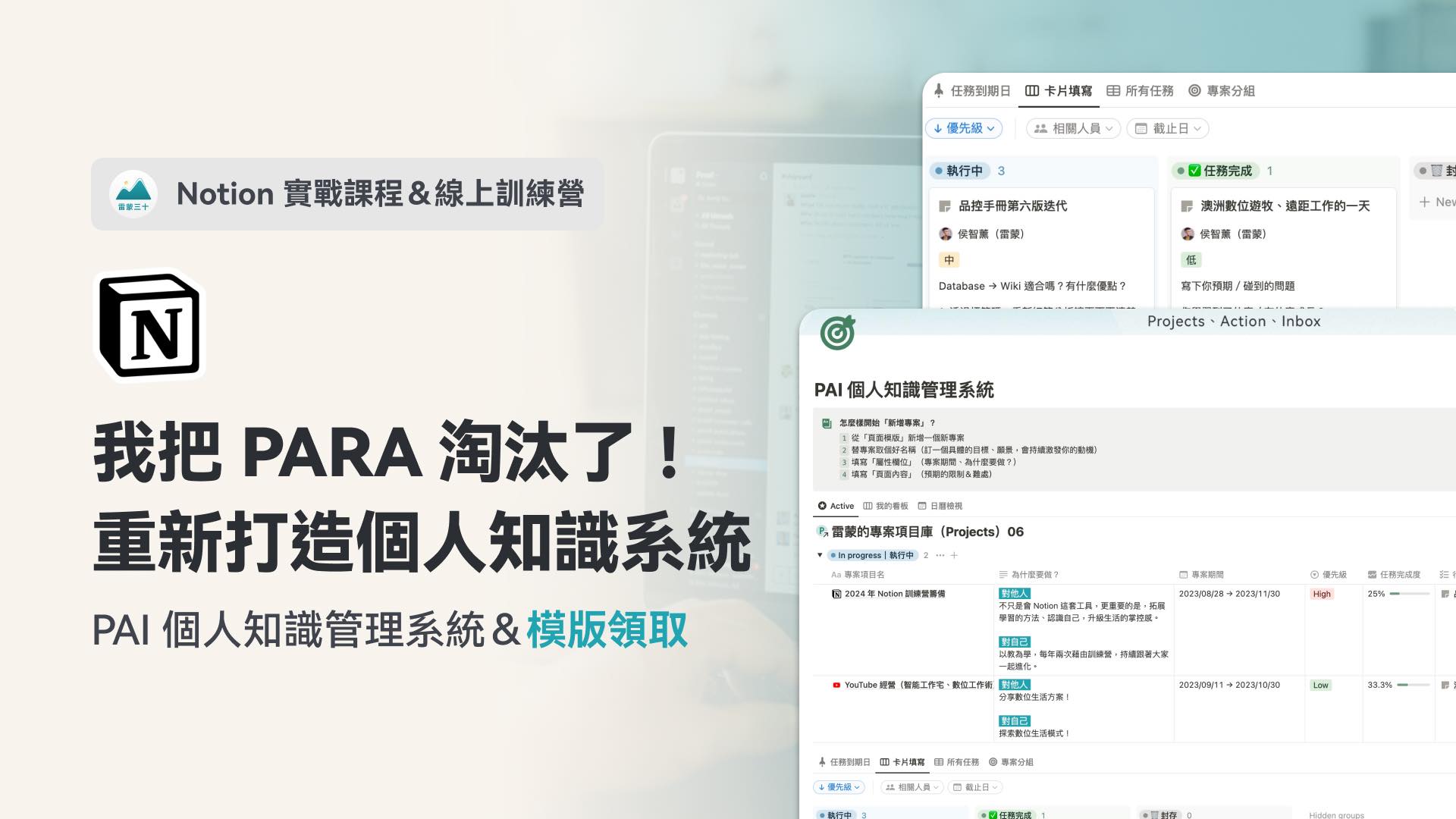 我既有的工作系統是從雷蒙提出的PAI系統沿用而來,不過再依據我自己的習慣做了內部微調,所以本來就持有「工作切分成許多專案」的概念。如果想認識「PAI系統」可以去看下面這些資料,都是雷蒙分享的資源。而我先前也曾寫過關於PAI系統的文章「PARA vs. PAI:破解 2 大系統盲點,打造高產出工作術!」,是過去分享自己使用PARA和PAI的場景。